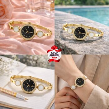 Elegant Gold-Tone Bracelet Watch with Black Dial and Mother-of-Pearl Accents
