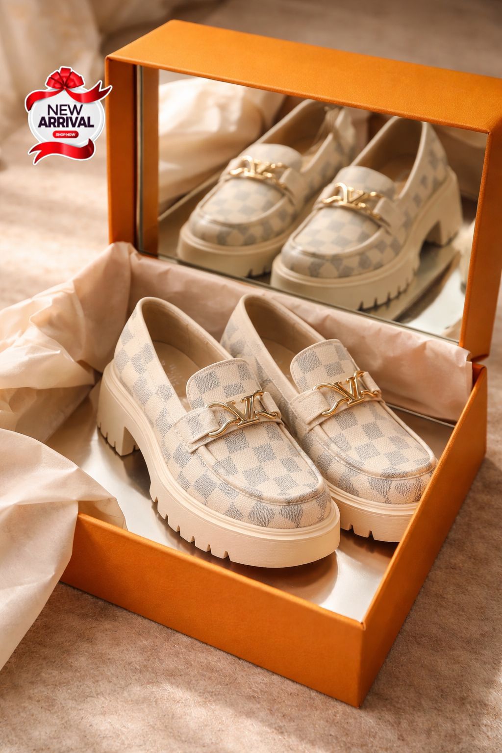 Redefine your footwear collection with these striking checkered platform loafers. Merging traditional elegance with contemporary streetwear influences, these shoes are designed for the woman who wants to stand out while maintaining a polished aesthetic. The soft cream and light grey checkered pattern offers a neutral yet eye-catching palette that complements a wide variety of seasonal wardrobes.