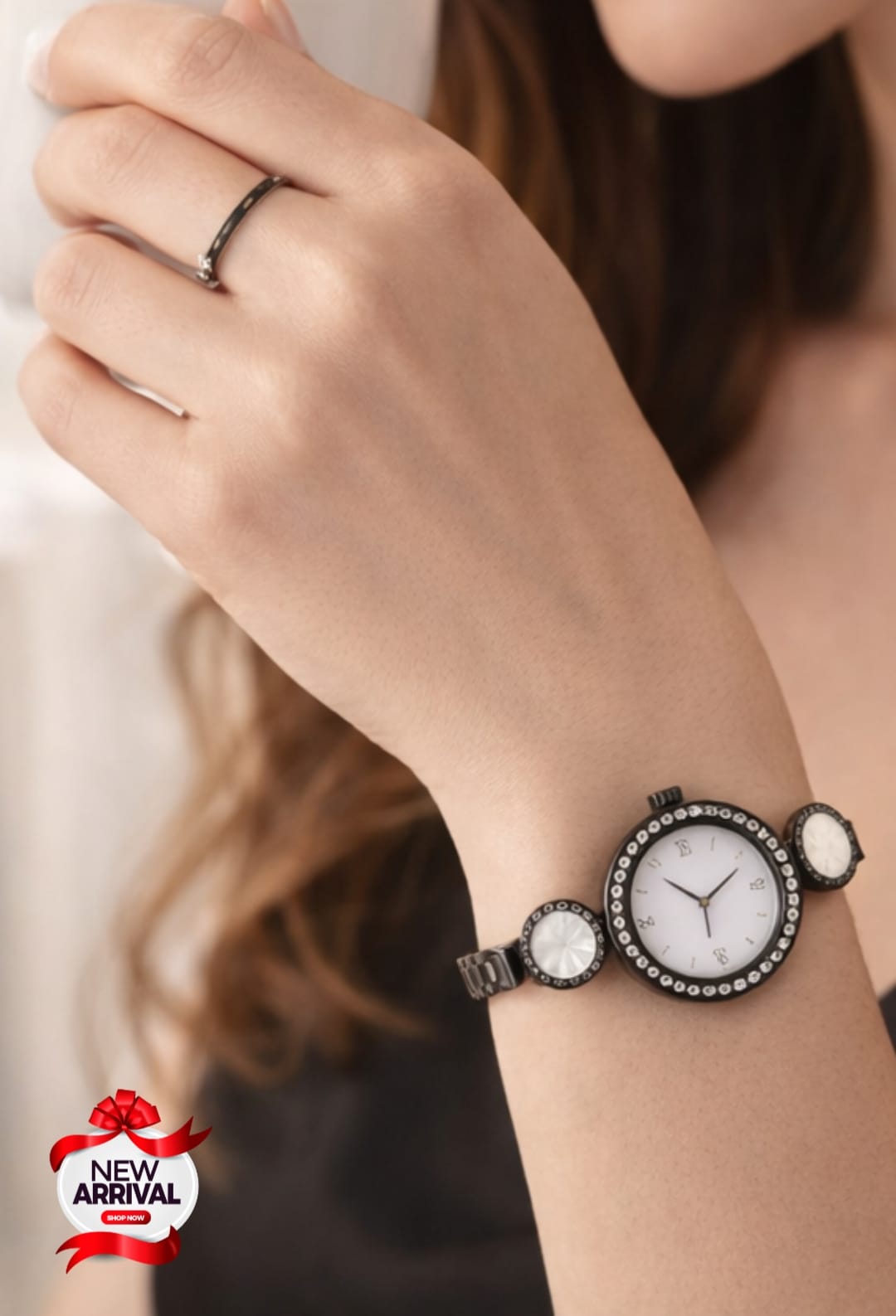 The heart of this piece is its striking deep black dial, which provides a bold, high-contrast backdrop for the slender gold hands. The bezel is meticulously lined with shimmering crystals that catch the light from every angle, ensuring a subtle sparkle with every movement of your wrist. Flanking the main dial are two circular mother-of-pearl style stones, encased in their own halo of crystals. These accents add a soft, organic texture that balances the sleek metal and dark face, creating a unique “trinity” design that mimics a high-end designer bracelet.