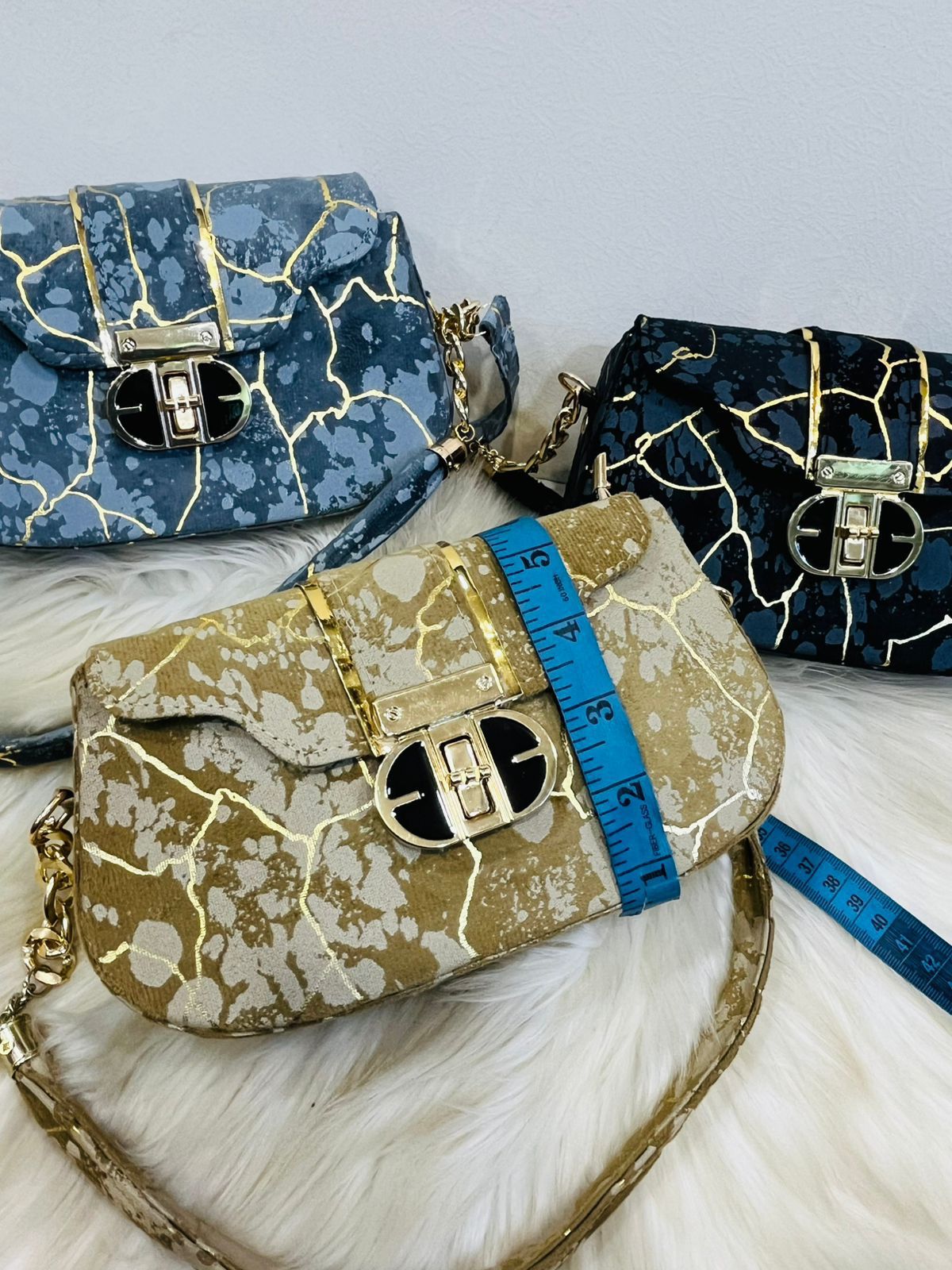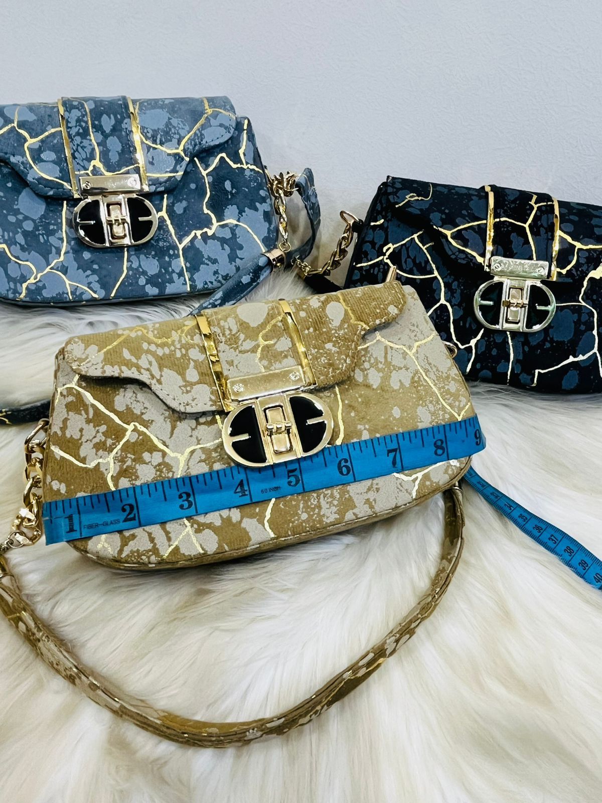 This stunning crossbody bag features a unique kintsugi-inspired marble design with striking gold-veined accents. Equipped with a secure designer-style clasp and a luxury chain-link strap, it is the perfect statement piece for any fashion-forward wardrobe.