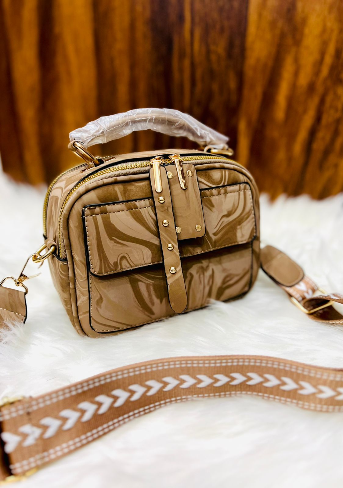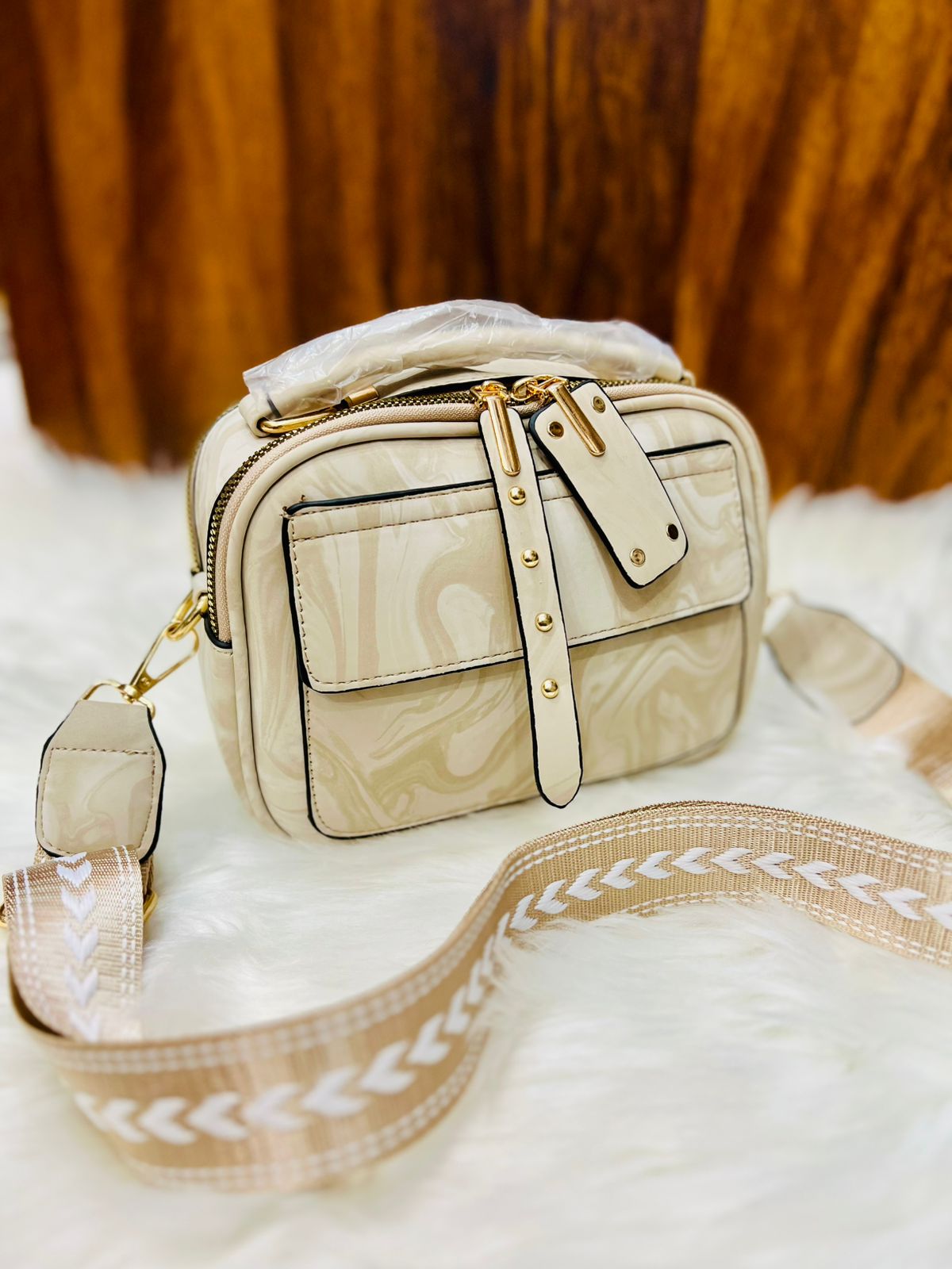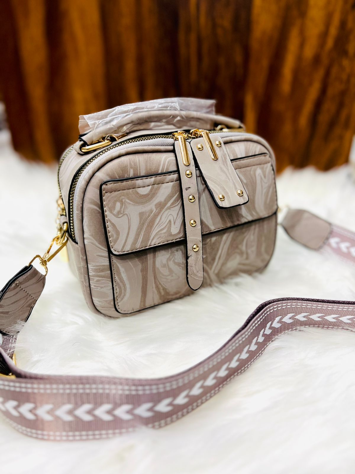 Elegant Marbled Multi-Zip Satchel with Patterned Guitar Strap