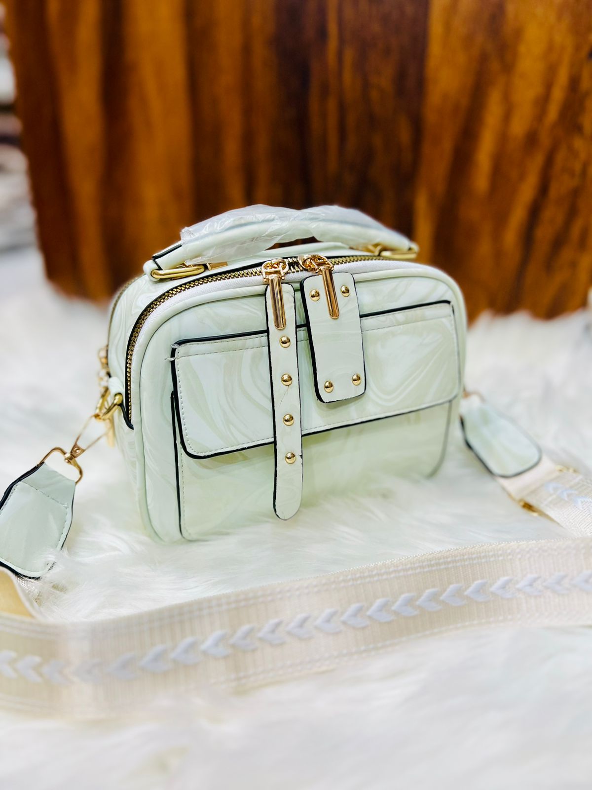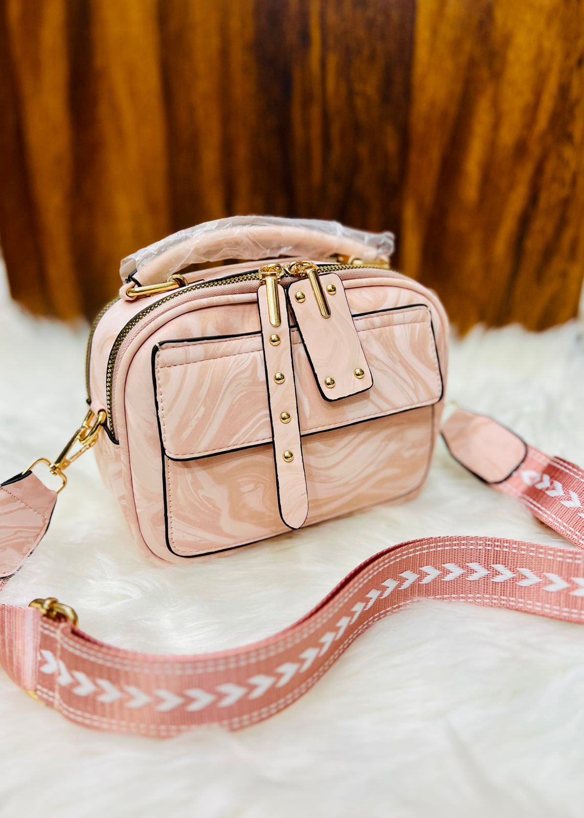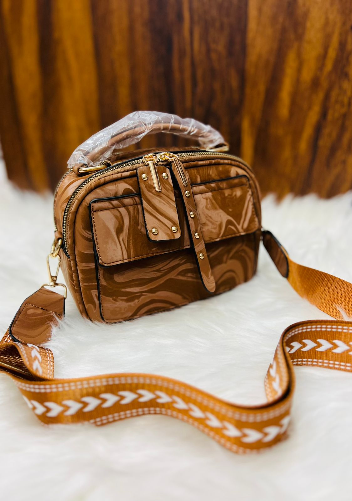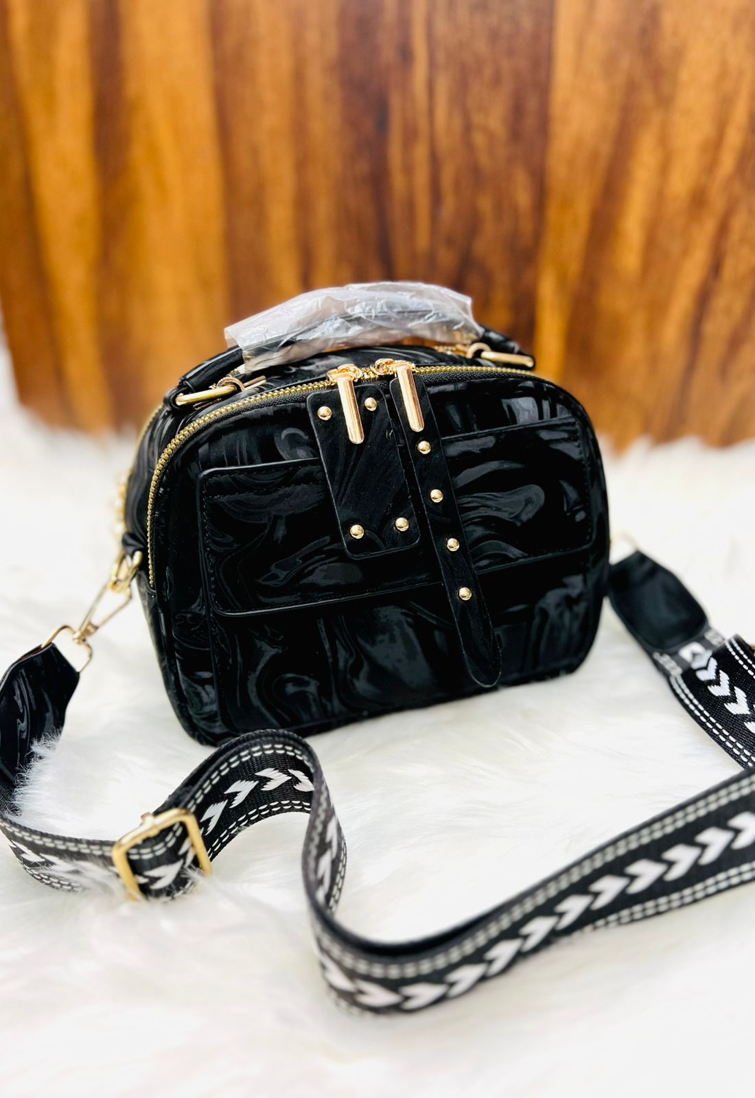 Elegant Marbled Multi-Zip Satchel with Patterned Guitar Strap