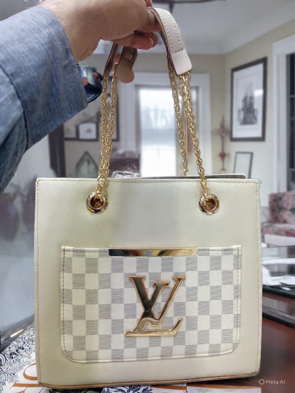 Elevate your everyday style with this stunning structured tote, featuring a bold monogrammed front pocket and luxurious gold-tone chain handles. Perfectly blending classic patterns with modern sophistication, this handbag is a versatile essential for the fashion-forward woman.