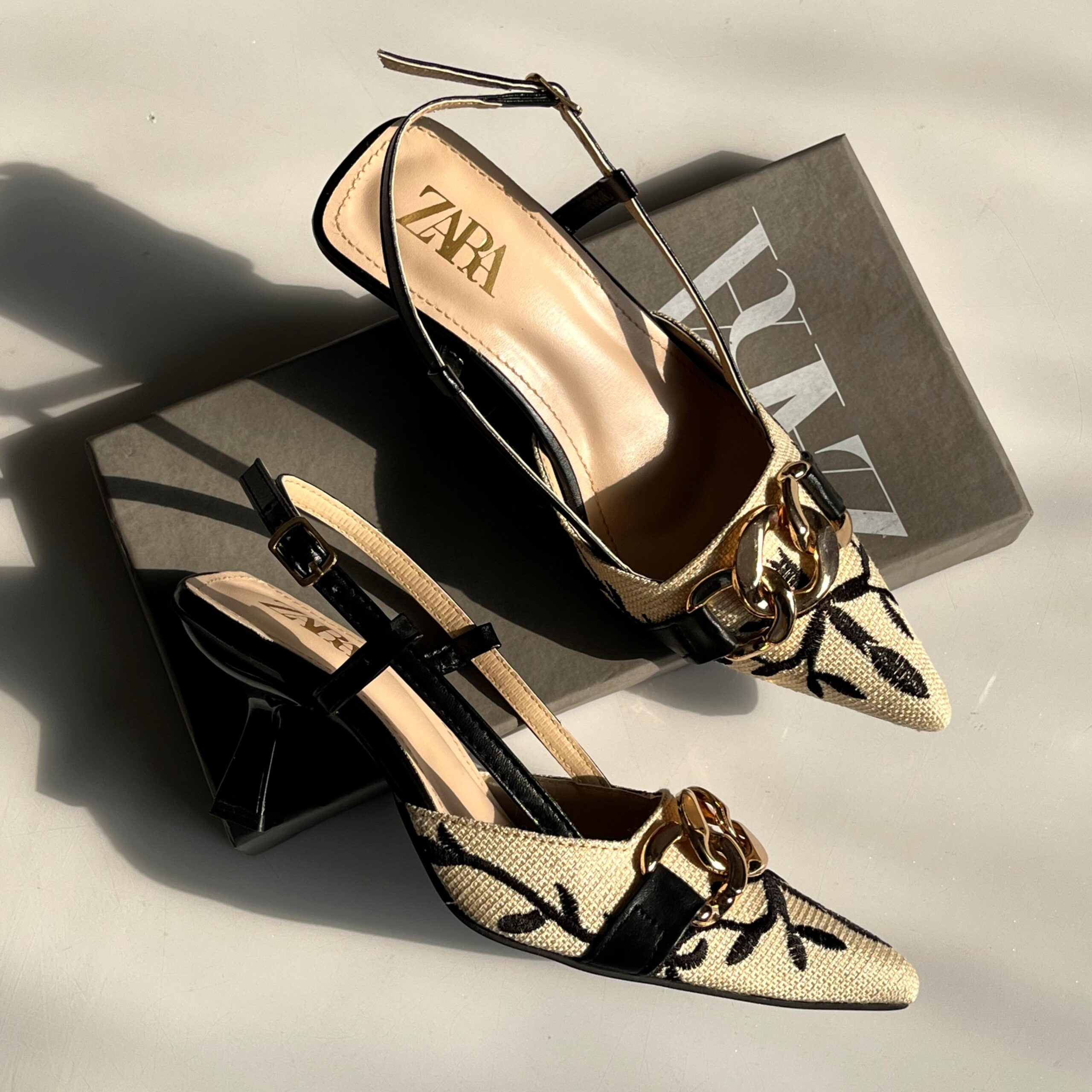 Embroidered Pointed-Toe Slingback Heels with Chain Detail