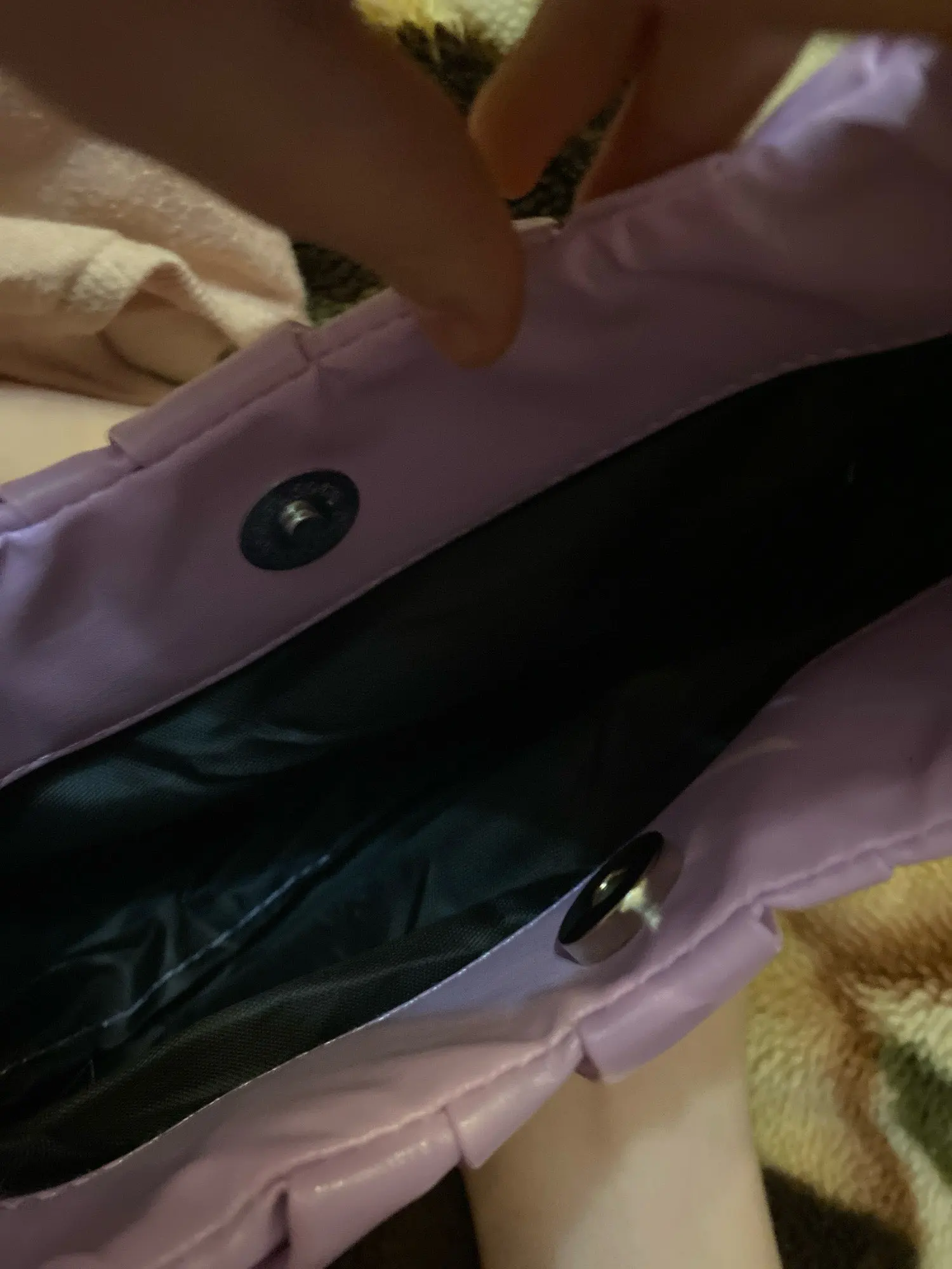 The storage area inside makes a bit of a plastic sound, but the bag is pretty and doesn’t smell!