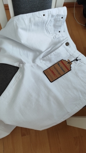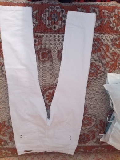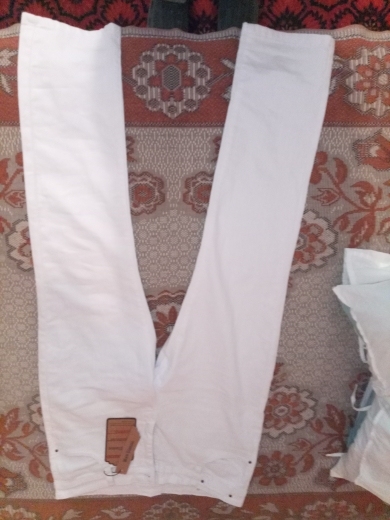 White summer linen pants. Thin. Haven’t worn it yet. At first glance, they look cool. I will wear it with a linen shirt. Packed in a package on the rack. The size fits.