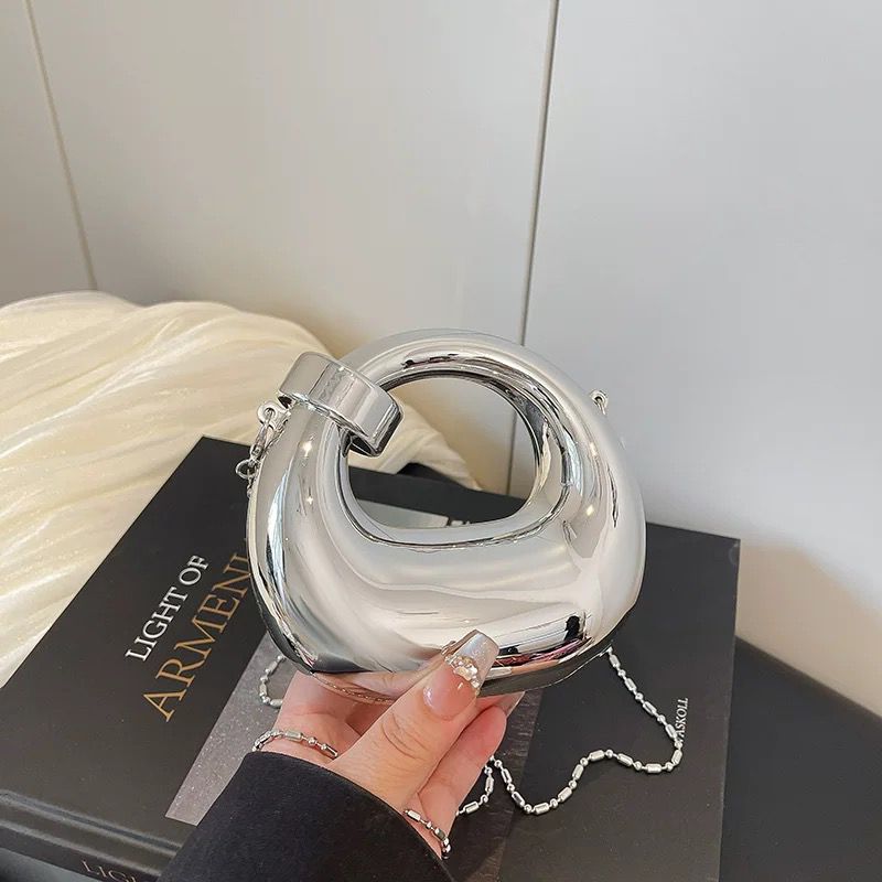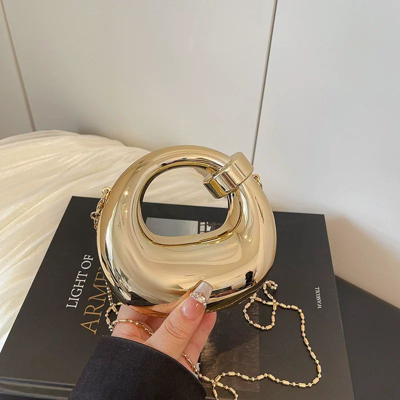 Elevate your evening ensemble with this stunning metallic sculptural handbag. Featuring a unique circular silhouette and a high-shine mirror finish, this statement accessory blends avant-garde art with modern fashion.