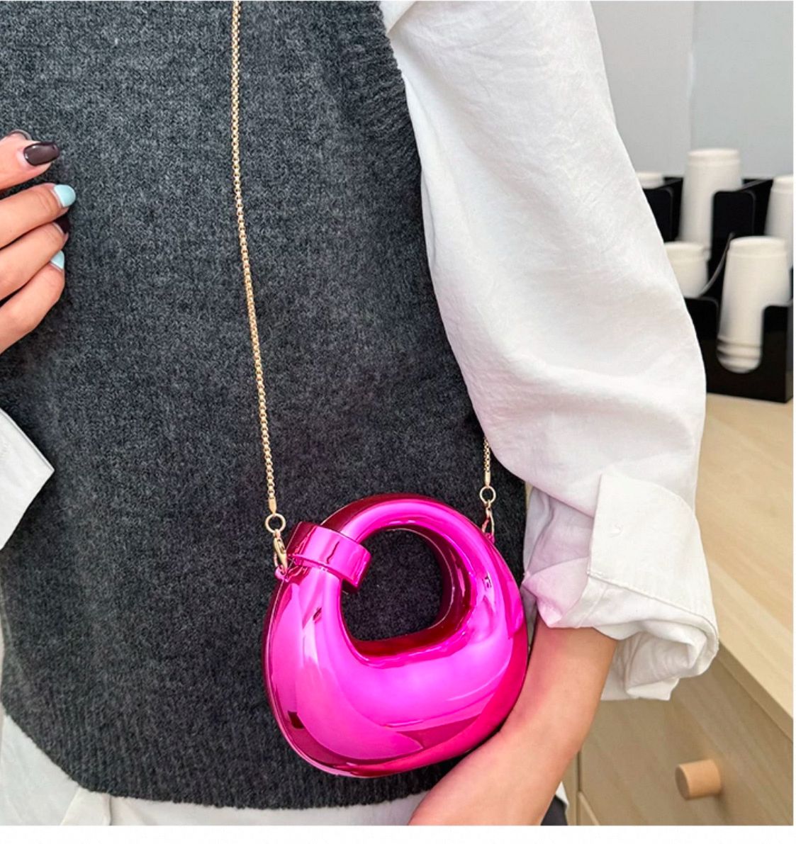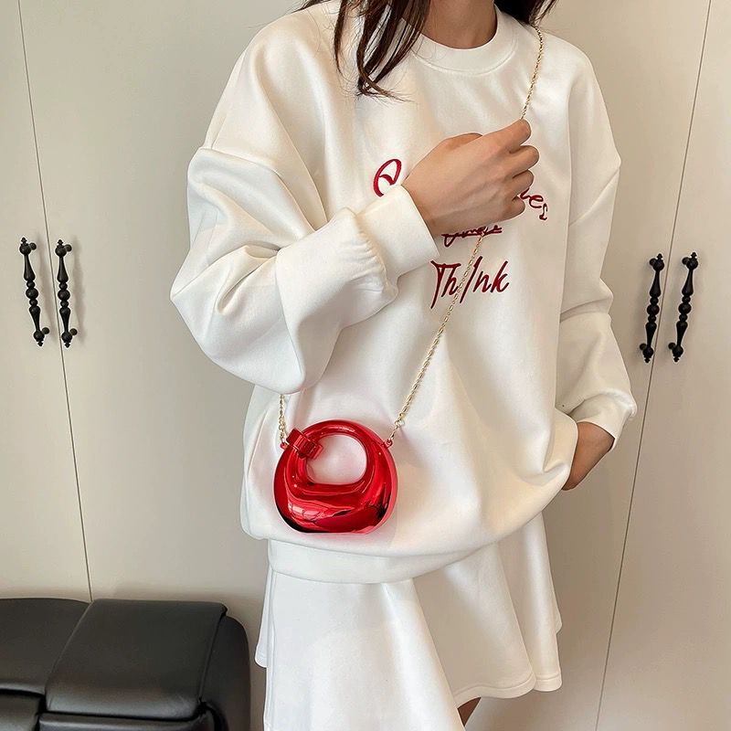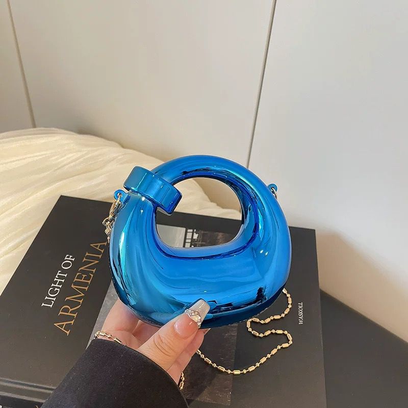 While its appearance is bold, its utility is thoughtful. Each bag comes equipped with a delicate metallic chain strap, allowing you to transition effortlessly from a handheld clutch to a sophisticated crossbody or shoulder bag. The high-gloss finish—available in a spectrum of vibrant jewel tones and classic metallics—complements everything from a minimalist slip dress to a structured power suit.