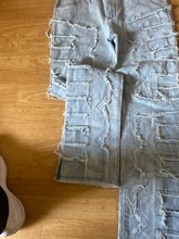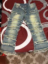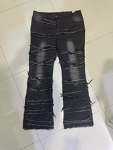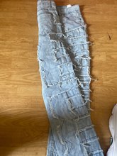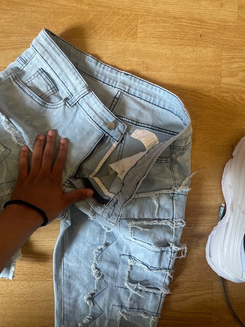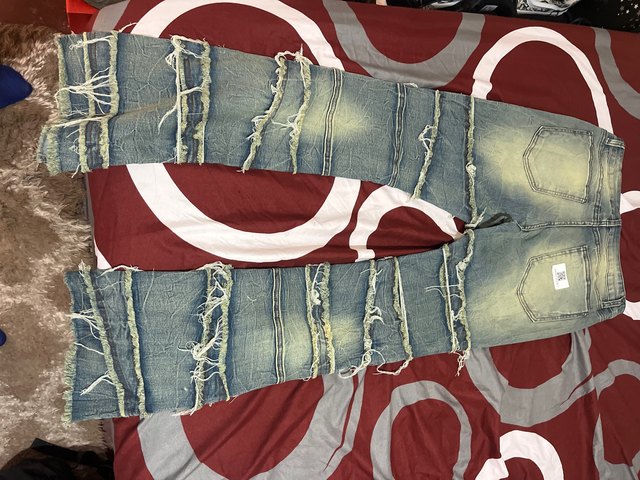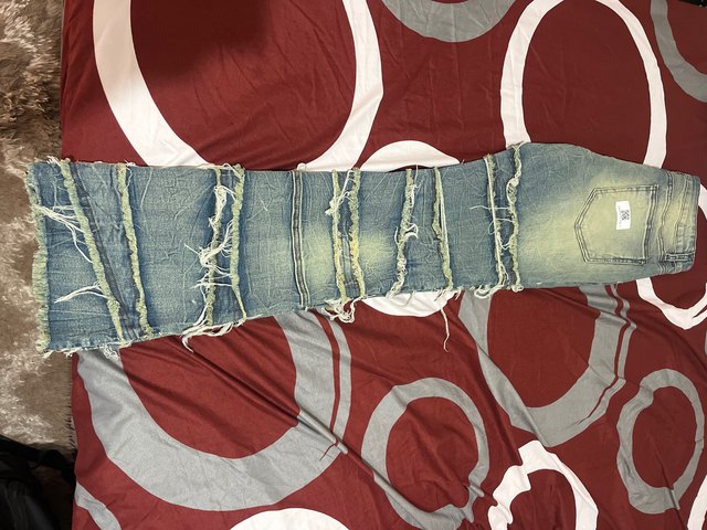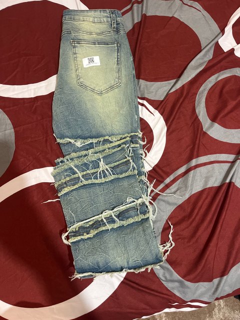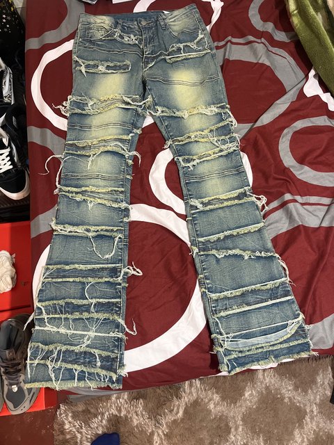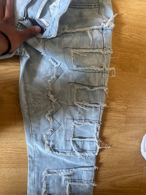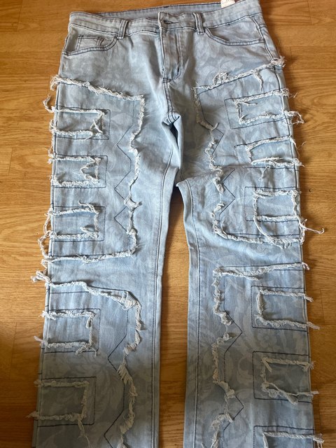 To preserve the unique frayed texture and the integrity of the distressed patches, we recommend washing these pants inside out in cold water. Tumble dry on low or hang dry to maintain the elasticity of the slim-fit denim. Over time, the fraying may evolve slightly, further enhancing the personalized, vintage character of the garment.
