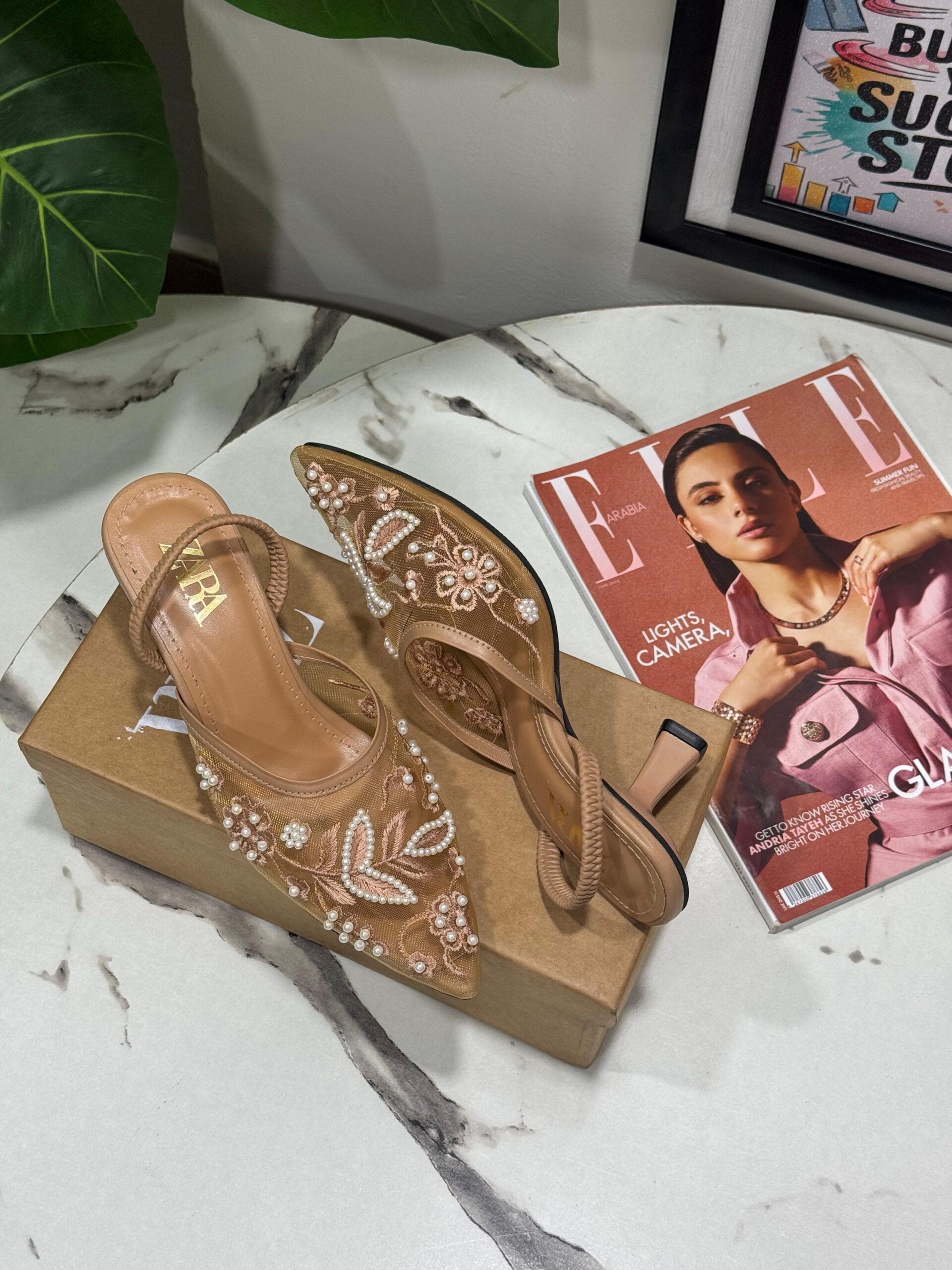 Experience the perfect blend of modern sophistication and timeless femininity. These elegantly crafted slingback heels feature delicate floral embroidery and hand-applied pearl accents over a breathable mesh upper, making them the ultimate statement piece for your next special occasion.