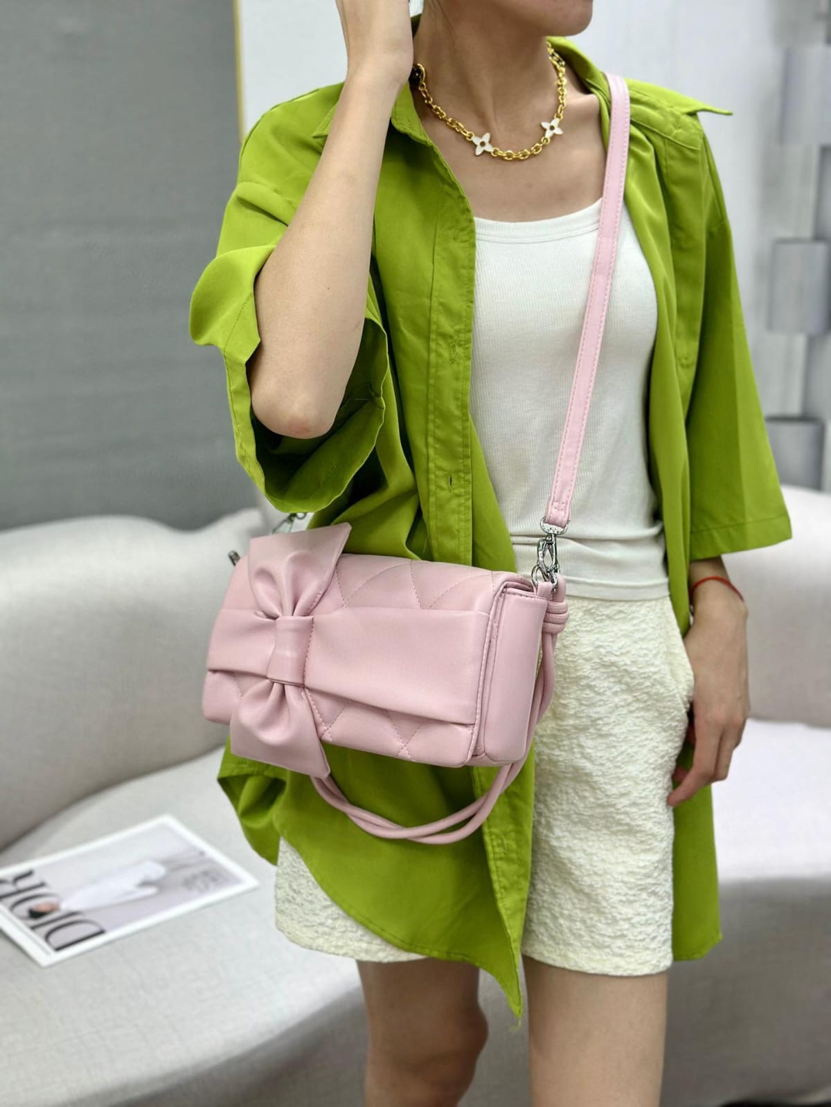 Redefine your daily ensemble with a handbag that captures the essence of contemporary femininity. This Quilted Bow-Accent Shoulder Bag is designed for the woman who loves to balance classic textures with bold, statement details. The bag’s exterior features a soft, high-quality quilted pattern that provides a timeless, luxurious feel, while the oversized structural bow on the front serves as a chic focal point, adding a touch of whimsical flair to a sleek silhouette.