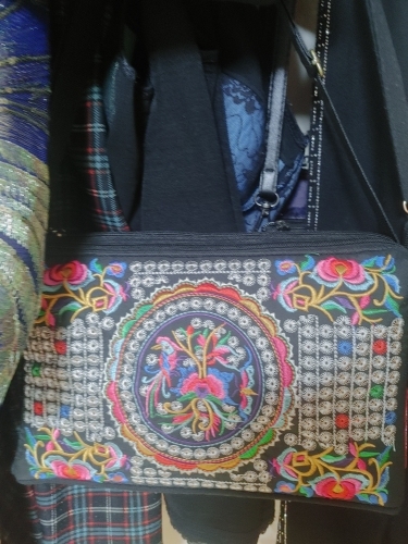 I liked the handbag, medium size, not small, bright embroidery, 3 deep compartments with zippers.