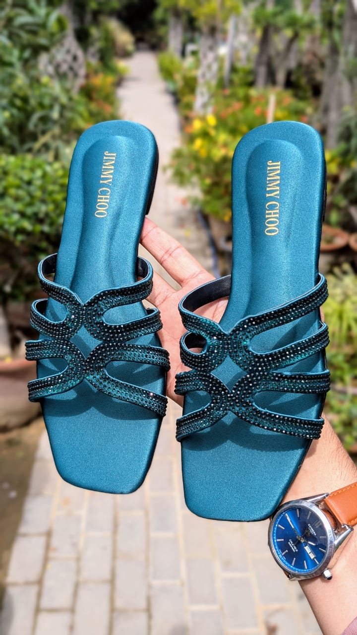 These stylish women’s slides feature a striking emerald green color and a squared toe design for a modern look. The upper straps are beautifully adorned with sparkling rhinestones in an elegant, criss-cross pattern, adding a touch of glamour. With a comfortable, cushioned footbed, these slides are perfect for adding a bit of sparkle to any casual or dressy outfit. They are ideal for warm weather and can effortlessly transition from a day out to an evening event.